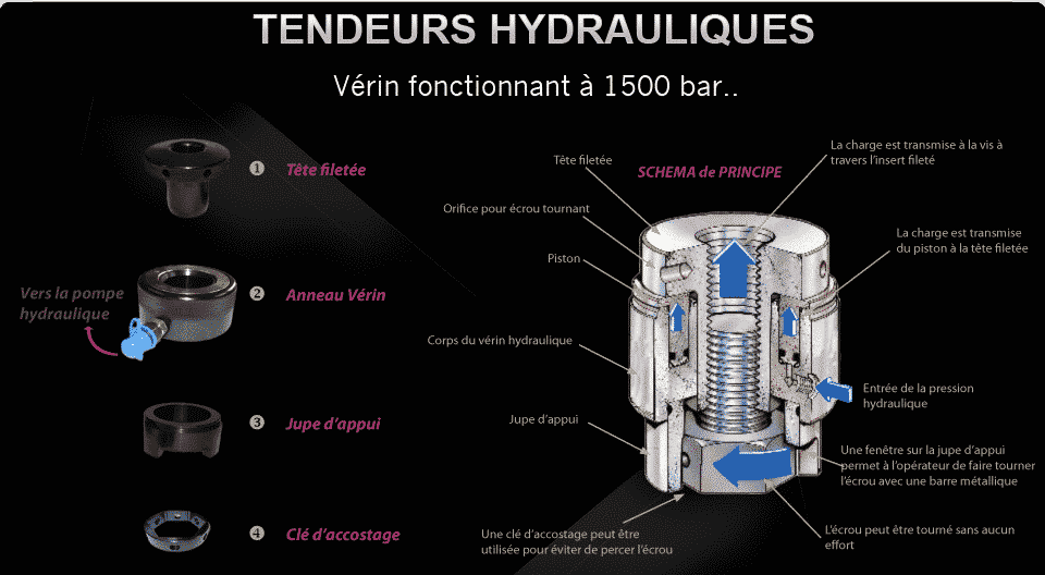Un tendeur hydraulique est un vérin fonctionnant à 1500 bar, permettant d’exercer un effort de traction sur une tige filetée. Après avoir mis en pression le vérin tendeur, à la pression correspondant à l’effort souhaité, il suffira de serrer l’écrou au contact de sa face d’appui, puis de relâcher la pression du vérin, pour obtenir le serrage.